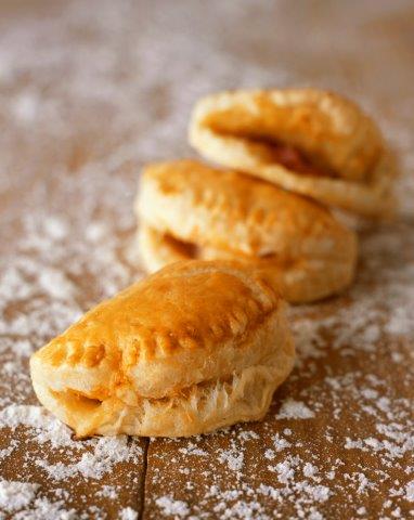 - Αλευρώνετε τον πάγκο της κουζίνας και τοποθετείτε τα στρογγυλά ή τετράγωνα σφολιατάκια, αφού τα ξεπαγώσετε. Παίρνετε μ’ ένα κουταλάκι λίγη γέμιση και τη βάζετε στο κέντρο της ζύμης, διπλώνετε το σφολιατάκι, πιέζετε τις άκρες και ενώνετε σε σχήμα μισοφέγγαρου (αν είναι στρογγυλό) ή τριγώνου (αν είναι τετράγωνο).