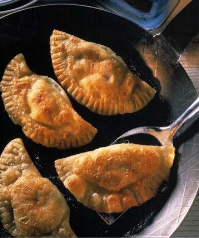 - Ετοιμάζετε τη ζύμη σύμφωνα με τη βασική συνταγή για πίτες και πιτάκια. Ανοίγετε ένα λεπτό φύλλο και κόβετε με στρογγυλά κουπ πατ. Ανακατεύετε καλά όλα τα υλικά της γέμισης. Βάζετε 1 γεμάτη κουταλιά από τη γέμιση στο κέντρο κάθε φύλλου και τα διπλώνετε σα μισοφέγγαρα. Με τα δάχτυλα σας κλείνετε για κολλήσουν οι άκρες και με ένα πιρούνι δίνετε το σχήμα που βλέπετε στη φωτογραφία.