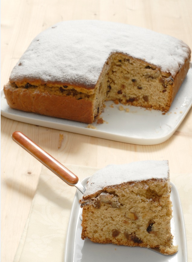 - Χτυπάτε το βούτυρο με τη ζάχαρη. Προσθέτετε τα αυγά, ένα-ένα, χτυπώντας πάντα ενδιάμεσα. Συνεχίζετε με το χυμό πορτοκαλιού και εν συνεχεία ρίχνετε σταδιακά το αλεύρι με την κανέλα ανακατεύοντας ώστε να αφομοιώνεται. Τέλος προσθέτετε τα αλευρωμένα καρύδια και τις σταφίδες. Ανακατεύετε να μοιραστούν στο μείγμα.