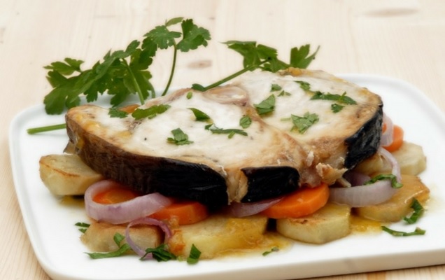 - Αλείφετε με λάδι ένα ορθογώνιο αντικολλητικό ταψάκι και τοποθετείτε σε στρώσεις τις πατάτες, τα καρότα και τα κρεμμύδια. Σκορπίζετε το σέλινο και αλατοπιπερώνετε. Πλένετε και στεγνώνετε τις φέτες του ψαριού.