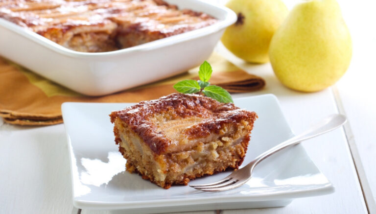 Όσο το κέικ είναι καυτό μπορείτε να απλώσετε στην επιφάνειά του μαρμελάδα αχλάδι και να πασπαλίσετε με αμύγδαλα εφιλέ. Εναλλακτικά σερβίρετε με ξινή κρέμα, παγωτό βανίλια ή σαντιγί.