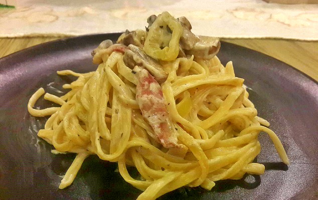- Σε μεγάλο βαθύ τηγάνι, ρίχνετε το ελαιόλαδο και το βούτυρο. Σοτάρετε τις πιπεριές, τα μανιτάρια και το μπέικον, προσθέτοντας λίγο επιπλέον ελαιόλαδο κατά τη διάρκεια του σοταρίσματος.