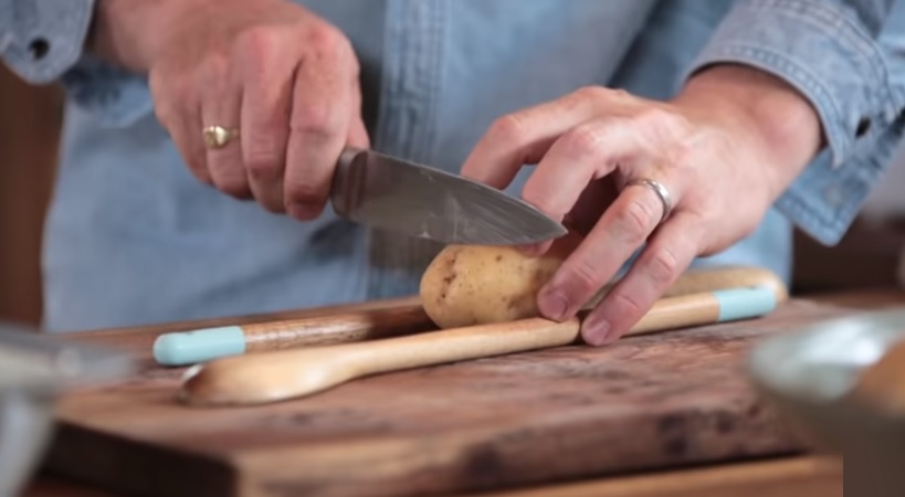 Στο βίντεό του ο Βρετανός σεφ δείχνει πώς σταθεροποιεί απλά την πατάτα ανάμεσα στα εργαλεία κουζίνας. Δίνει δε τη δική του συνταγή από πατάτες – ακορντεόν με ελαιόλαδο και θυμάρι, όπου στο τέλος προσθέτει καβουρντισμένο τρίμμα ψωμιού και φουντούκια.