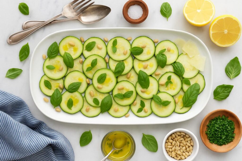 Υλικά: 4 μικρά, φρέσκα κολοκυθάκια, ξύσμα και χυμό από ένα λεμόνι, λίγο αλάτι και πιπέρι, 1/4 του φλιτζανιού κουκουνάρι, 2 κουταλιές της σούπας βασιλικό, 60 γρ. φλούδες παρμεζάνας ή μετσοβόνε, 3 κουταλιές της σούπας ελαιόλαδο και 1 1/2 κουταλιά της σούπας χυμό λεμονιού