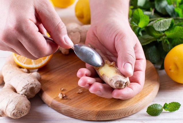 Το μόνο που χρειάζεστε για να απαλλάξετε την αρωματική πιπερόριζα από την εξωτερική της φλούδα είναι ένα κουτάλι. Χρησιμοποιώντας το κουτάλι ως αποφλοιωτή, ξύνετε την εξωτερική επιφάνεια του τζίντζερ αφαιρώντας πανεύκολα το λεπτό περίβλημα από τη ρίζα.