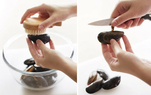 Προετοιμάζοντας τα φρέσκα μύδια για μαγείρεμα