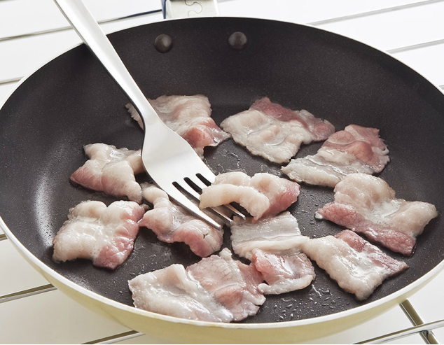 Προσθέτετε στο υπόλοιπο λάδι το σκόρδο, το θυμάρι και το ξίδι. Ανακατεύετε καλά. Περιχύνετε το σπανάκι με λίγο από το μείγμα του λαδιού. Κόβετε κάθε φέτα μπέικον σε 3 κομμάτια και τα τηγανίζετε σε αντικολλητικό τηγάνι χωρίς λιπαρή υλη μέχρι να ροδίσουν ελαφρά.