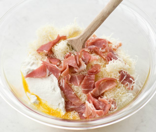 Για τη γέμιση: • 150 γρ. προσούτο Ευρυτανίας ή ζαμπόν κομμένο σε λεπτά κομματάκια • 150 γρ. ανθότυρο κομματιασμένο • 200 γρ. τυρί κρέμα • 100 γρ. κεφαλογραβιέρα ή πεκορίνο τριμμένο • 2 κουταλιές της σούπας μαϊντανός ψιλοκομμένος • 2 αυγά χτυπημένα • αλάτι, πιπέρι