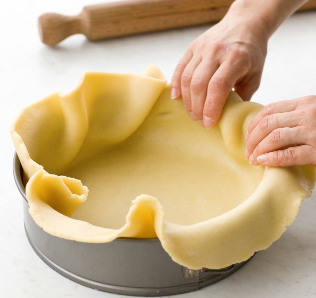 2o βήμα. Ανοίγετε τη ζύμη σε φύλλο χοντρό με τα δάχτυλά σας ή με χοντρό πλάστη και την απλώνετε σε ταψί στρογγυλό διαμ. 32 εκ., ώστε να καλυφτεί ο πάτος και τα πλαϊνά και να εξέχει από πάνω. Κόβετε τα περισσεύματα της ζύμης με την ανάποδη λάμα ενός μαχαιριού. Αφήνετε να ξεκουραστεί 20΄.