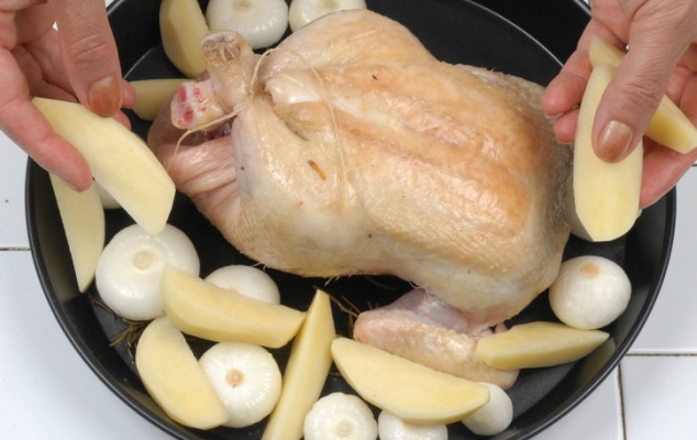 ΒΗΜΑ 2. Ζεσταίνετε λίγο λάδι σε αντικολλητικό τηγάνι και σοτάρετε το κοτόπουλο μέχρι να αρχίσει να ροδίζει. Μεταφέρετε το κοτόπουλο σε στρογγυλό ταψάκι και το αλατοπιπερώνετε. Καθαρίζετε τις πατάτες, τις κόβετε σε μεγάλα κομμάτια και τις αλατοπιπερώνετε και αυτές.