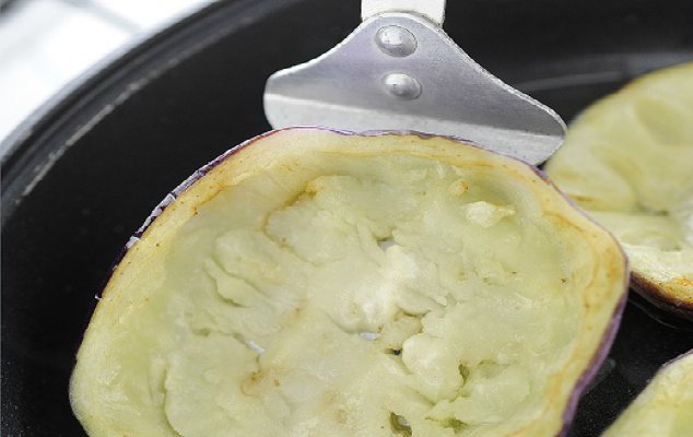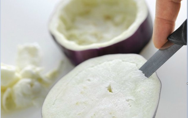 ΒΗΜΑ 1 Κόβετε εγκάρσια ένα καπάκι από κάθε μελιτζάνα και κατόπιν με ένα κουτάλι ή το ειδικό εργαλείο αφαιρείτε αρκετή από τη σάρκα τους. Πασπαλίζετε τις φωλιές μελιτζάνας με αλάτι και τις αφήνετε σε σουρωτήρι 20΄ να ξεπικρίσουν. Τις ξεπλένετε και τις στραγγίζετε καλά.
