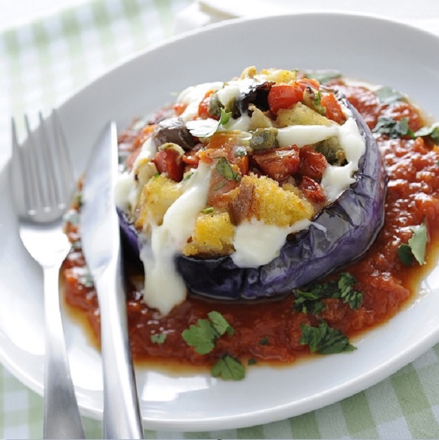 ΥΛΙΚΑ ΓΙΑ 6 ΑΤΟΜΑ • 6 μεγάλες μελιτζάνες φλάσκες • 200 γρ. κασέρι τριμμένο • 200 γρ. κεφαλογραβιέρα κομμένη σε κυβάκια • 2/3 του φλιτζανιού του τσαγιού ελαιόλαδο • 2 λιαστές ντομάτες ψιλοκομμένες • 200 γρ. ψωμί σε κύβους • 1 κρεμμύδι ψιλοκομμένο • 3 σκελίδες σκόρδου ψιλοκομμένες • 2-3 κουταλιές της σούπας μαϊντανός ψιλοκομμένος • 2-3 κουταλιές της σούπας κάππαρη ξαλμυρισμένη • 2 φλιτζάνια του τσαγιού έτοιμη ή σπιτική σάλτσα ντομάτας • 2 ώριμες ντομάτες σφιχτές • αλάτι, πιπέρι φρεσκοτριμμένο • λίγη ζάχαρη (προαιρετικά)