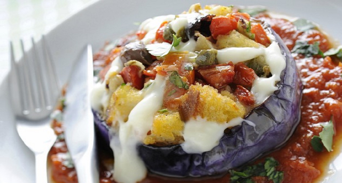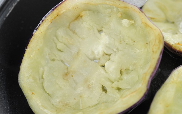 BHMA 2 Στο μεταξύ ζεσταίνετε ½ φλιτζάνι του τσαγιού λάδι και τηγανίζετε τις άδειες μελιτζάνες. Τις στραγγίζετε σε απορροφητικό χαρτί. Ετοιμάζετε το μείγμα της γέμισης ως εξής: ζεσταίνετε το υπόλοιπο λάδι και σοτάρετε τα κυβάκια του ψωμιού μέχρι να ροδίσουν. Τα στραγγίζετε και αυτά σε απορροφητικό χαρτί. Ξεφλουδίζετε τις ντομάτες και τις ψιλοκόβετε αφού αφαιρέσετε τους σπόρους και τα υγρά.