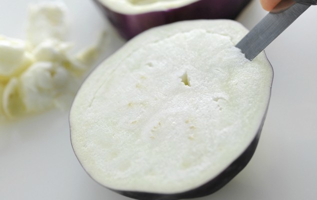 BHMA 1 Κόβετε εγκάρσια ένα καπάκι από κάθε μελιτζάνα και κατόπιν με ένα κουτάλι ή το ειδικό εργαλείο αφαιρείτε αρκετή από τη σάρκα τους. Πασπαλίζετε τις φωλιές μελιτζάνας με αλάτι και τις αφήνετε σε σουρωτήρι 20΄ να ξεπικρίσουν. Τις ξεπλένετε και τις στραγγίζετε καλά.