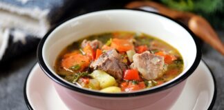 ΒΗΜΑ 1. Καθαρίζετε και κόβετε σε λεπτές φέτες τα κρεμμύδια, τα πράσα και την πιπεριά και τα σοτάρετε σε σιγανή φωτιά σε μια κατσαρόλα, μαζί με τρεις κουταλιές της σούπας λάδι και μερικές κουταλιές της σούπας ζωμό λαχανικών ή κρέατος. Κόβετε σε κύβους 3-4 εκ. το μοσχαρίσιο ψαχνό το αλατοπιπερώνετε, το αλευρώνετε και το ροδίζετε ομοιόμορφα στην ίδια κατσαρόλα, αφού προσθέσετε και το υπόλοιπο λάδι.