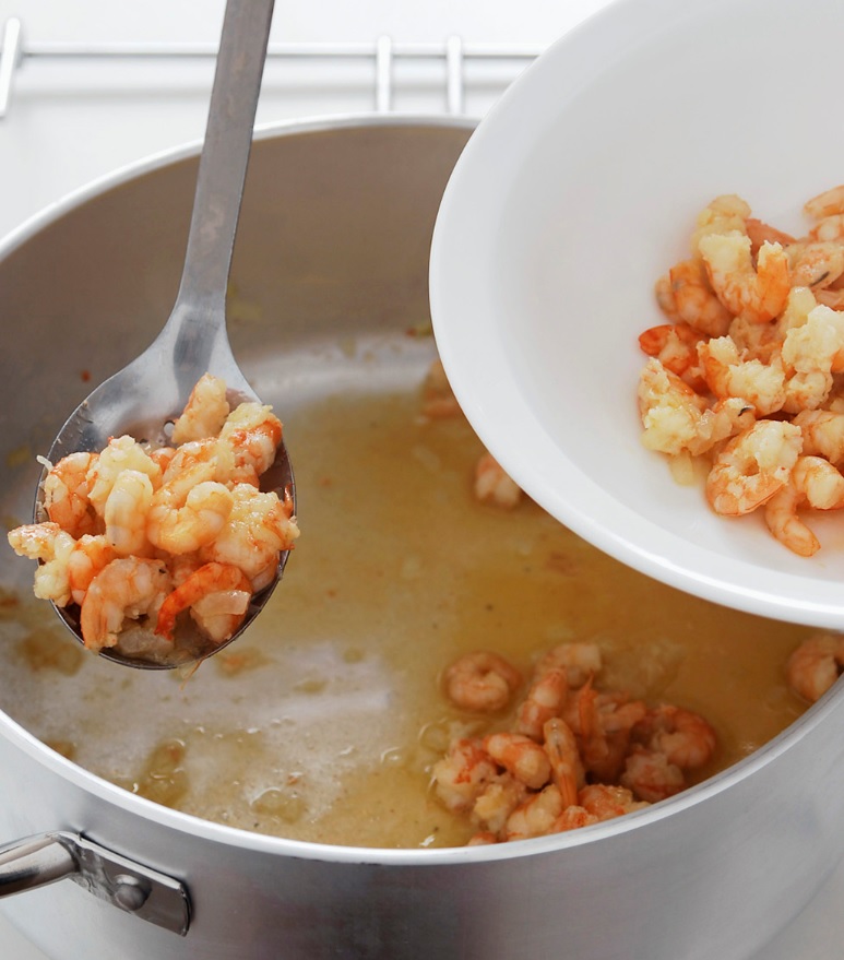ΒΗΜΑ 1. Zεματίζετε για 1΄τις γαρίδες σε αλατισμένο νερό, τις στραγγίζετε, τις αφήνετε να κρυώσουν λίγο και τις ξεφλουδίζετε. Ζεσταίνετε το μισό λάδι και σοτάρετε το σκόρδο. Προσθέτετε τις γαρίδες, λίγο πιπέρι ανακατεύετε και σβήνετε με το κονιάκ. Μετά από 2΄αφαιρείτε τις γαρίδες με τρυπητή κουτάλα και ρίχνετε τη σάλτσα τους σε ένα μικρό μπολ.