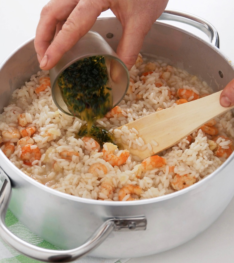 ΒΗΜΑ 3. Στο μπολ που κρατήσατε τη σάλτσα από τις γαρίδες προσθέτετε 5-6 κουταλιές το ζωμό λαχανικών, τα ψιλοκομμένα μυρωδικά και το πράσινο Tabasco. Ρίχνετε αυτό το μείγμα στο ριζότο και ανακατεύετε καλά. Σκεπάζετε την κατσαρόλα με πετσέτα, αφήνετε το ριζότο να τραβήξει τα αρώματα, κατόπιν πασπαλίζετε με πιπέρι και σερβίρετε.