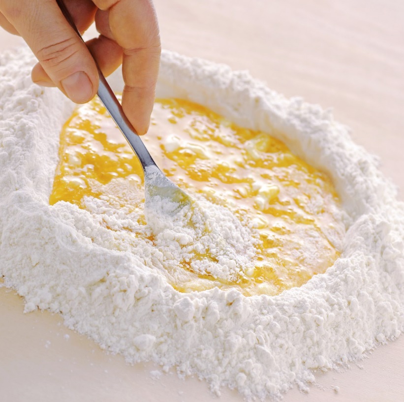 ΒΗΜΑ 1. Πάνω σε μια καθαρή κατά προτίμηση μαρμάρινη επιφάνεια ρίχνετε το αλεύρι σχηματίζοντας ένα βουναλάκι. Κάνετε μια λακκούβα στην κορυφή και ρίχνετε εκεί μέσα λίγο αλάτι, τα χτυπημένα αυγά και το λάδι. Παίρνετε σιγά σιγά το αλεύρι με τα δάχτυλα ή ένα πιρούνι και το στρώνετε προς το κέντρο για να ανακατευτεί με τα υπόλοιπα υλικά.