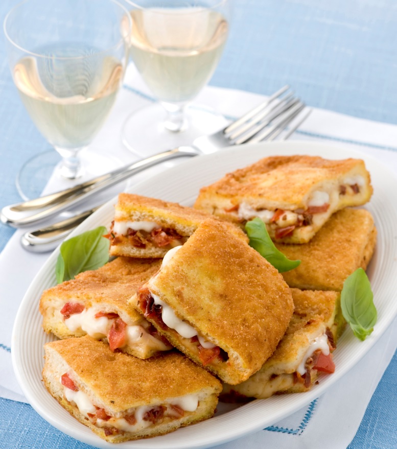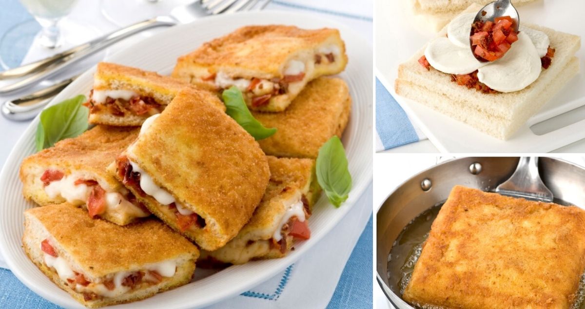Υλικά: • 8 φέτες ψωμί για τοστ (ψίχα) • 200 γρ. μοτσαρέλα σε φέτες (ταιριάζει και το κασέρι) • 2 ντομάτες κομμένες σε κυβάκια • 2 λιαστά ντοματάκια ψιλοκομμένα (προαιρετικά) • 500 γρ. γάλα εβαπορέ • 3 κρόκοι αυγών • αλάτι, πιπέρι φρεσκοτριμμένο • βούτυρο ή μαργαρίνη και ελαιόλαδο για το τηγάνισμα • 3 κουταλιές της σάλτσα πέστο έτοιμη ή σπιτική (προαιρετικά)