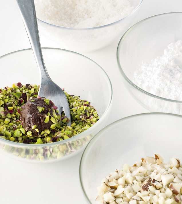 ΒΗΜΑ 3. Κατόπιν κυλάτε 16 τρουφάκια και πάνω στους ξηρούς καρπούς (τα φιστίκια και τα αμύγδαλα) και τέλος τα υπόλοιπα 8 στην τρούφα σοκολάτας ώστε να καλυφτούν από παντού. Αφήνετε τα τρουφάκια να παγώσουν καλά στο ψυγείο. Τα σερβίρετε μέσα σε μικρές χάρτινες θήκες.