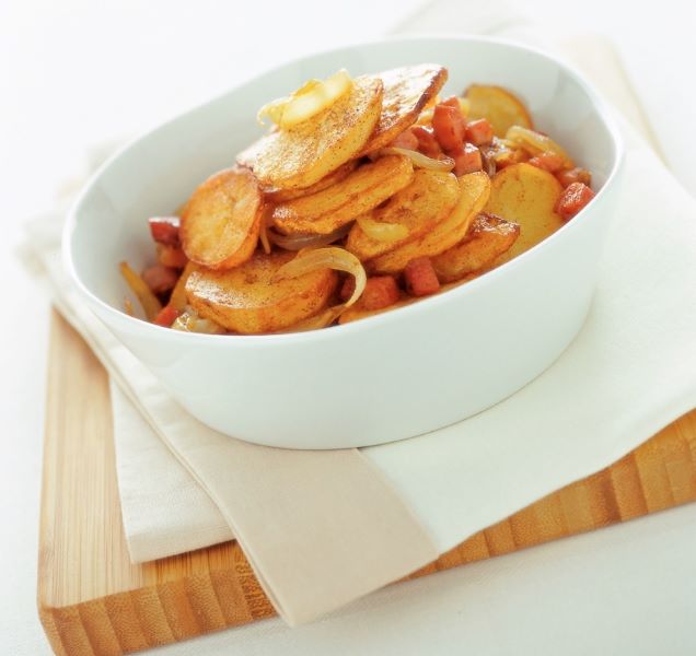 Τη συνταγή αυτή μπορείτε να τη φτιάξετε τόσο με Λουκάνικα Φρανκφούρτης όσο και με καπνιστό μπέικον. Τηγανισμένες με ένα από τα δύο αλλαντικά και με κρεμμύδι, οι πατάτες μετατρέπονται σε μεζέ ολκής για κρασί και για μπίρα.