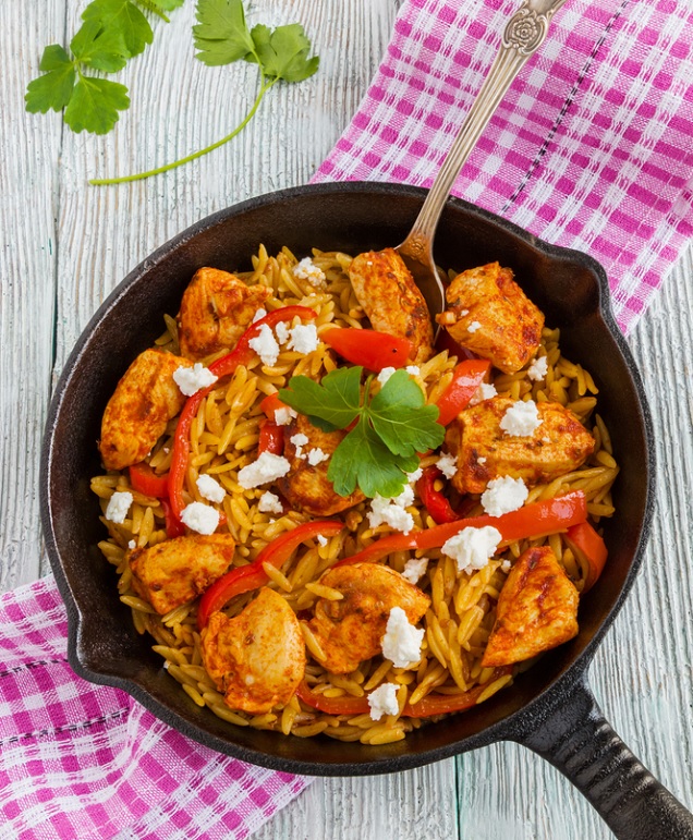 Υλικά: • 3 φιλέτα κοτόπουλο στήθος, κομμένα σε μπουκιές • 2 ξερά κρεμμυδια • 2 πιπεριές Φλωρίνης, σε λάδι ή σε άλμη • 1 κόκκινη πιπεριά φρέσκια • 3 κουταλιές της σούπας ελαιόλαδο • 3 κουταλιές της σούπας λευκό κρασί • 1 ντομάτα καθαρισμένη, περασμένη από τον τρίφτη (προαιρετικά) • 150 γρ. φέτα, τριμμένη • αλάτι και πιπέρι λίγο • 2 κουταλιές της σούπας μαϊντανός, ψιλοκομμένος • κριθαράκι ή ρύζι για το σερβίρισμα