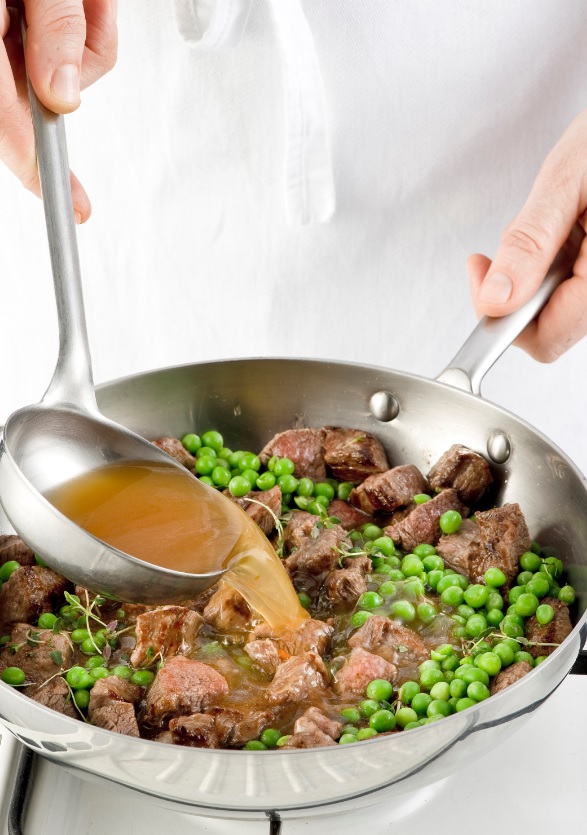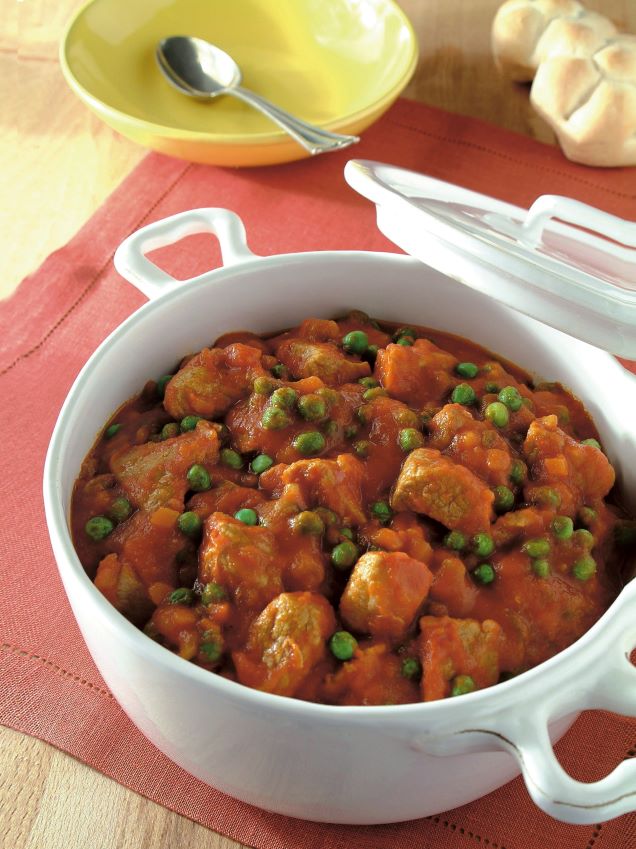 Μοσχαράκι κοκκινιστό με αρακά σε σπιτικό ζωμό