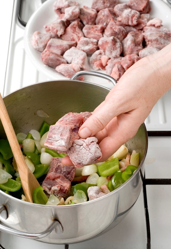 ΒΗΜΑ 2 Αλατοπιπερώνετε και αλευρώνετε ελαφρά τους κύβους τους κρέατος. Σε μεγάλη κατσαρόλα ζεσταίνετε ½ φλιτζάνι λάδι και ροδίζετε το κρέας, τα κρεμμυδάκια και την πιπεριά, ανακατεύοντας διαρκώς. Προσθέτετε το κρασί και το μισό ζωμό που φτιάξατε και σιγοβράζετε για 45’.